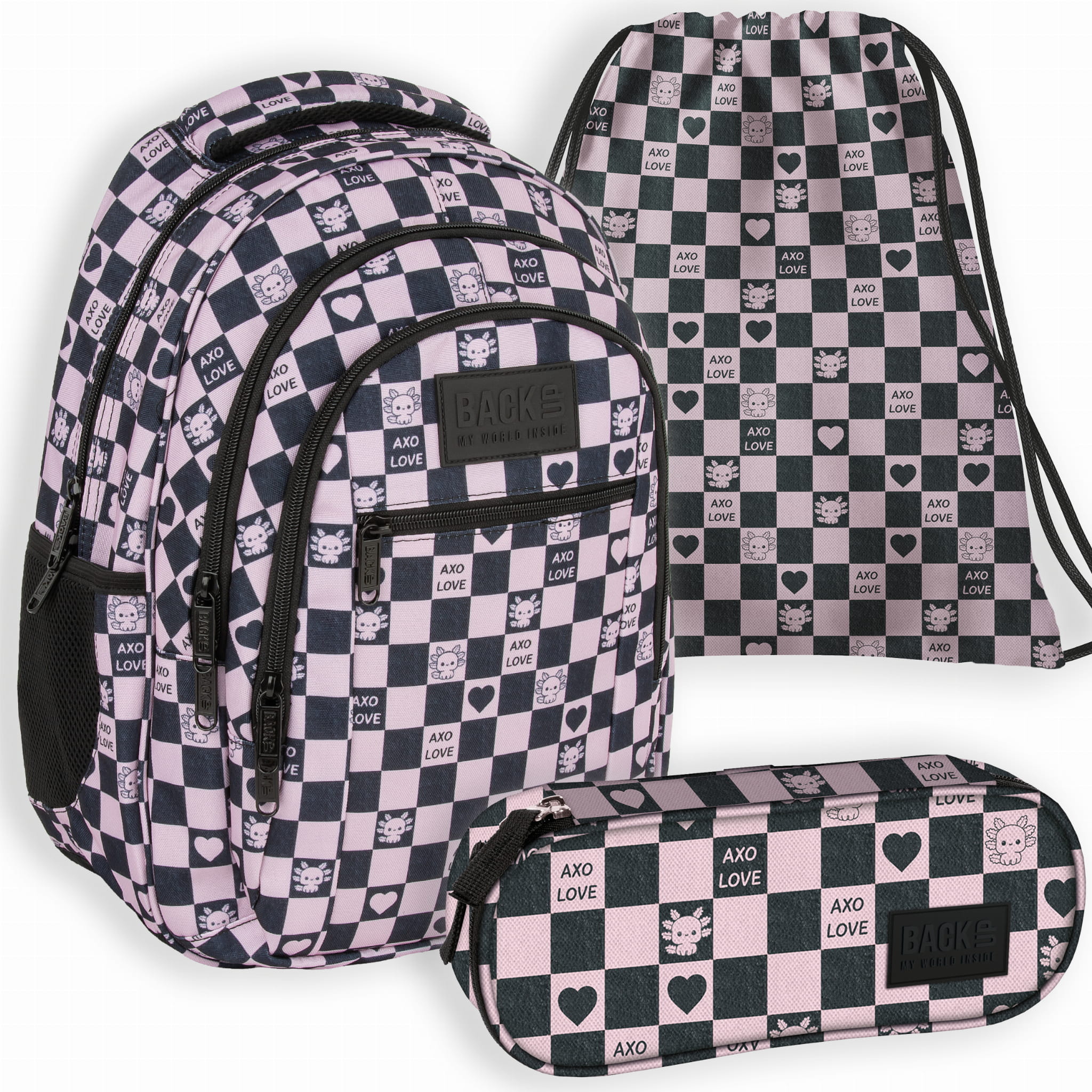 3W1PLECAK BACKUP SZKOLNY AXOLOT KRATKA+PIÓRNIK+WOREK UNISEX, STYLOWY WZÓR