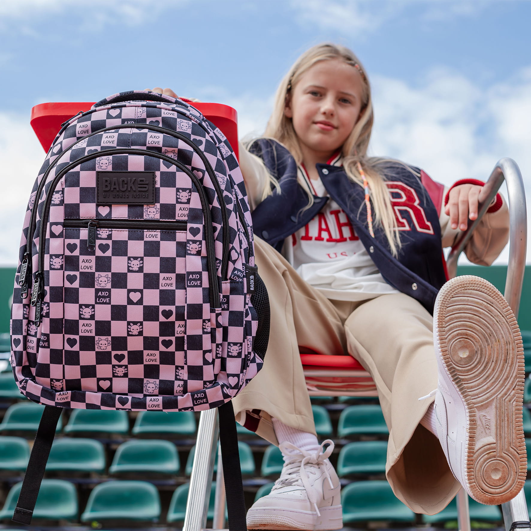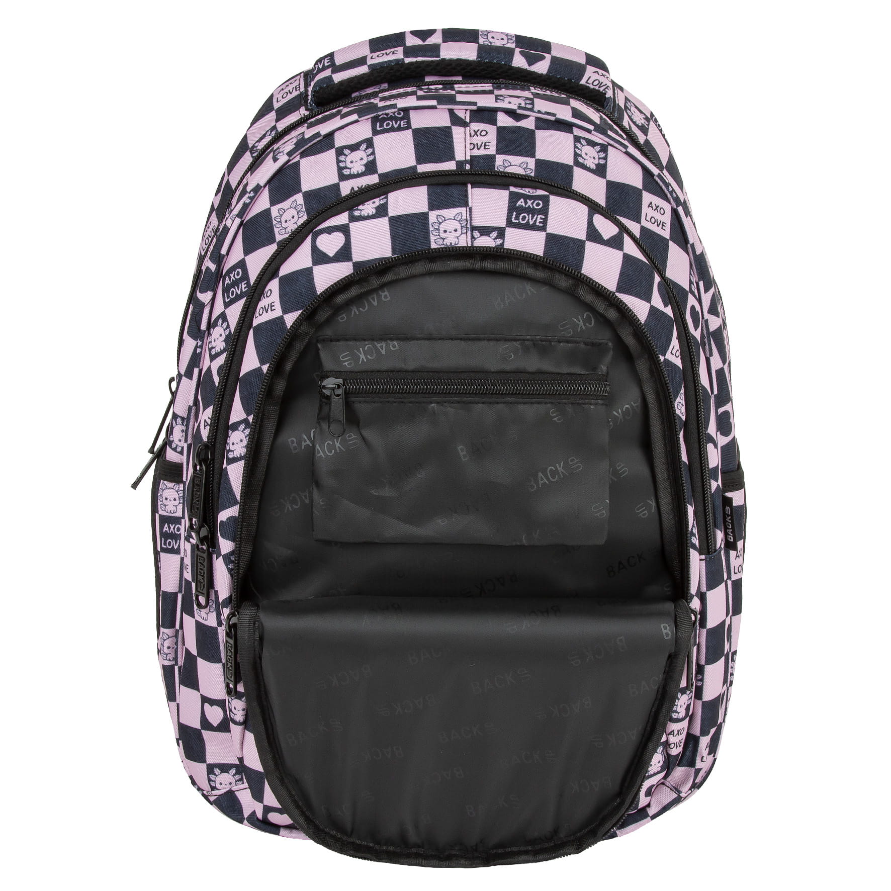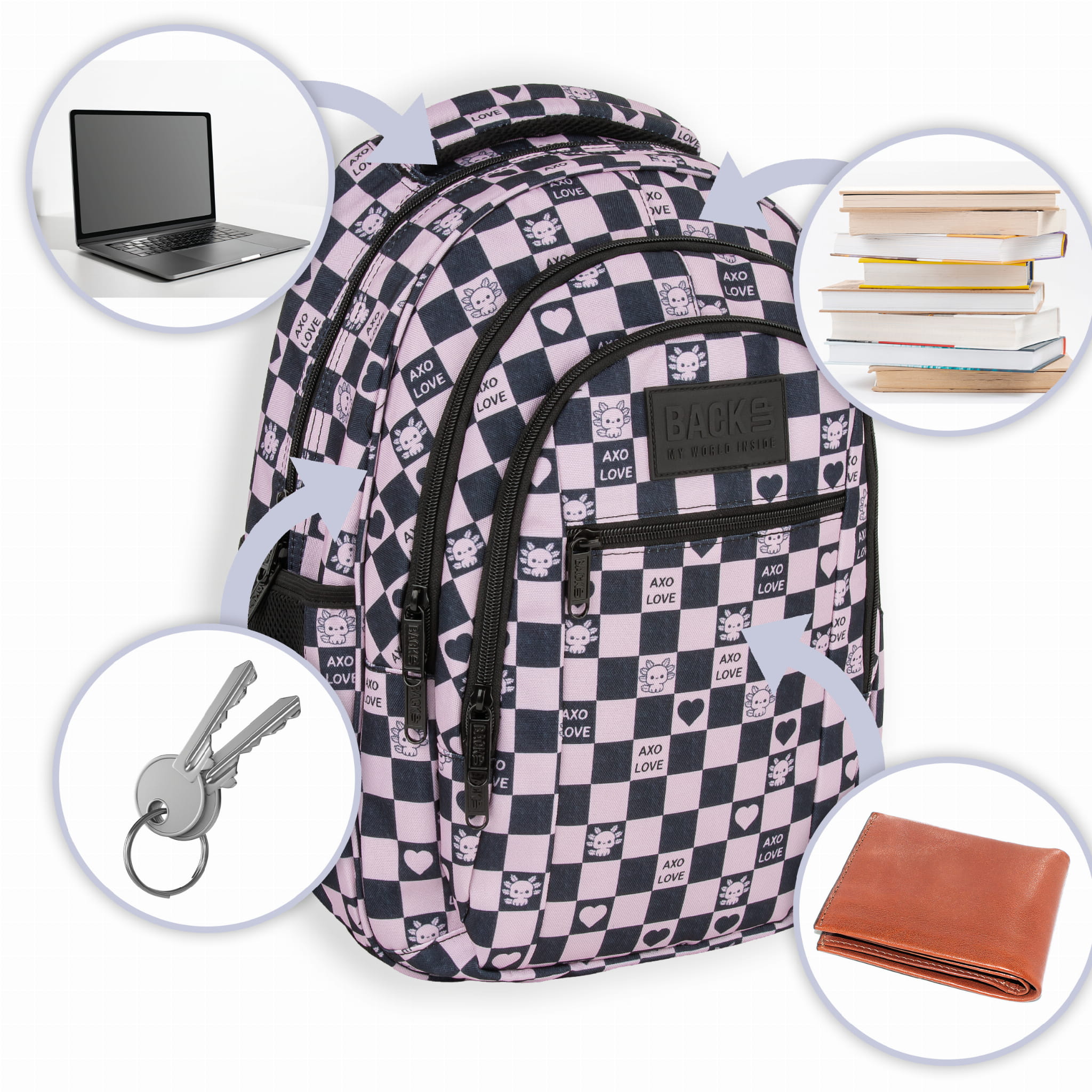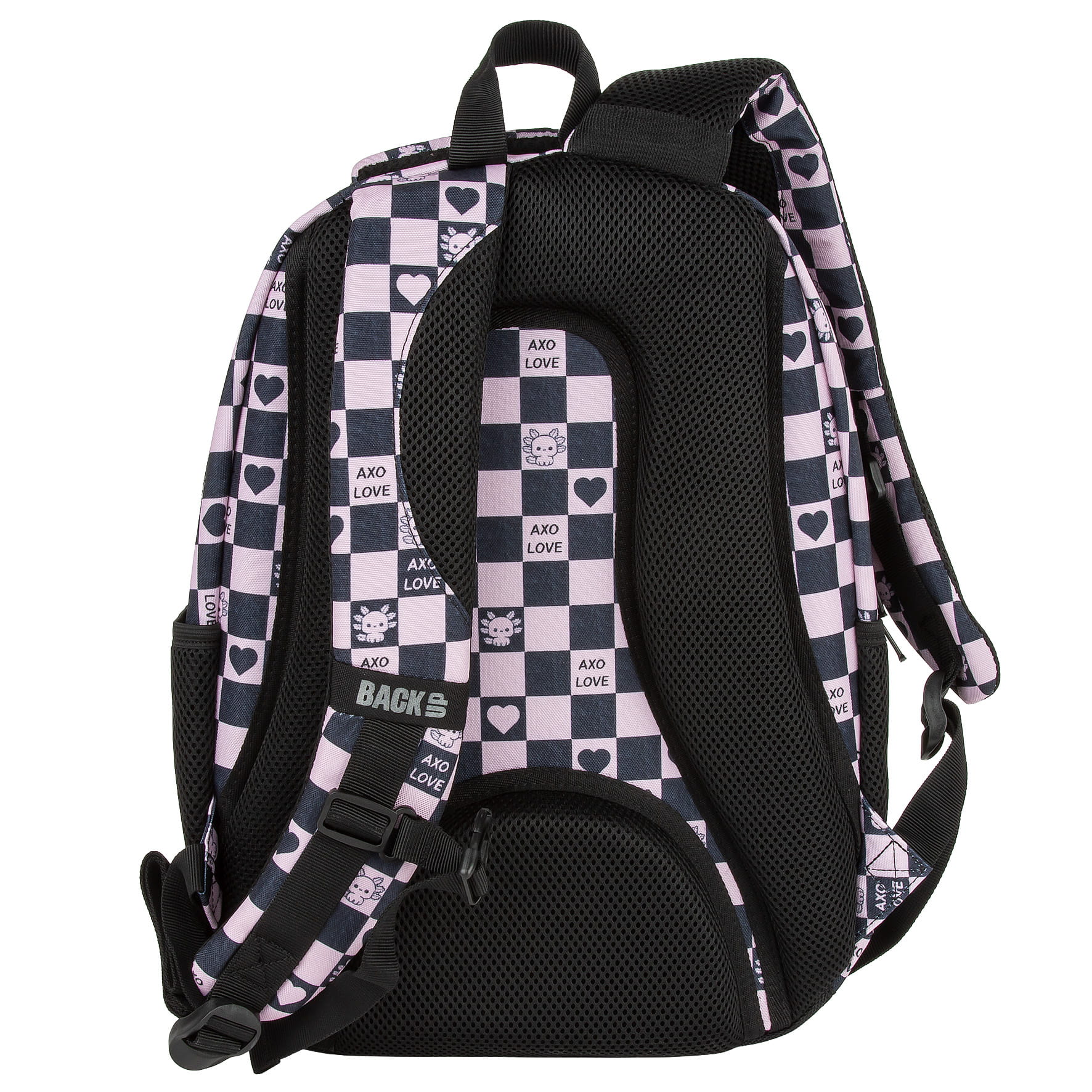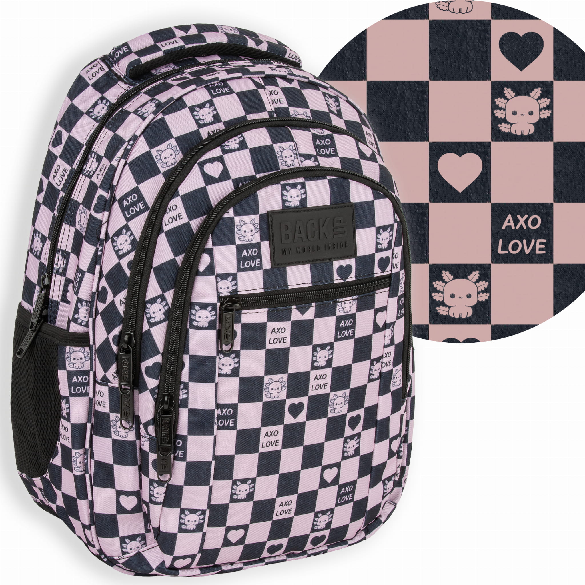 Taniej w zestawie!Plecak szkolny dla dziewczynki Back Up szachownica z axolotlem, kratka 26 l