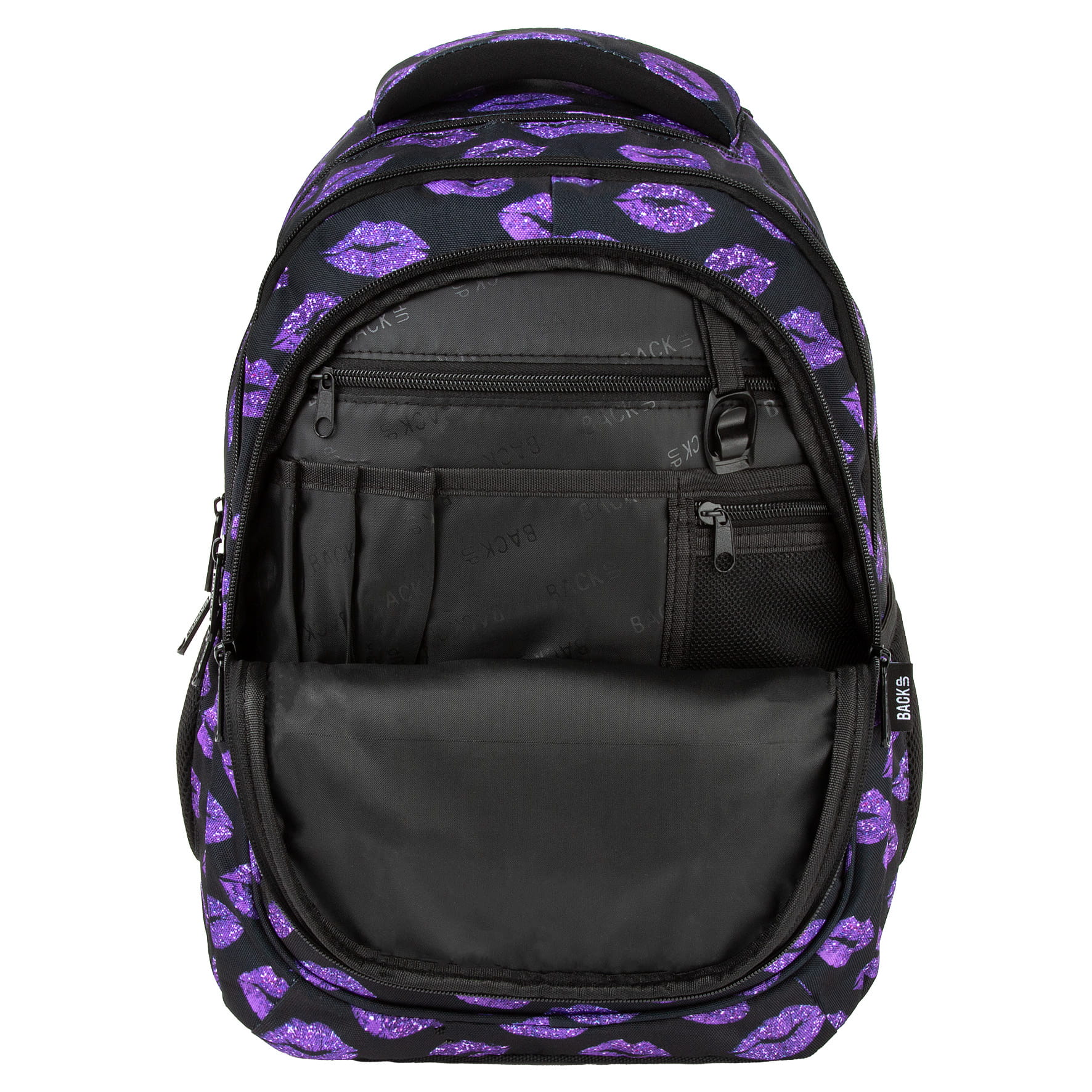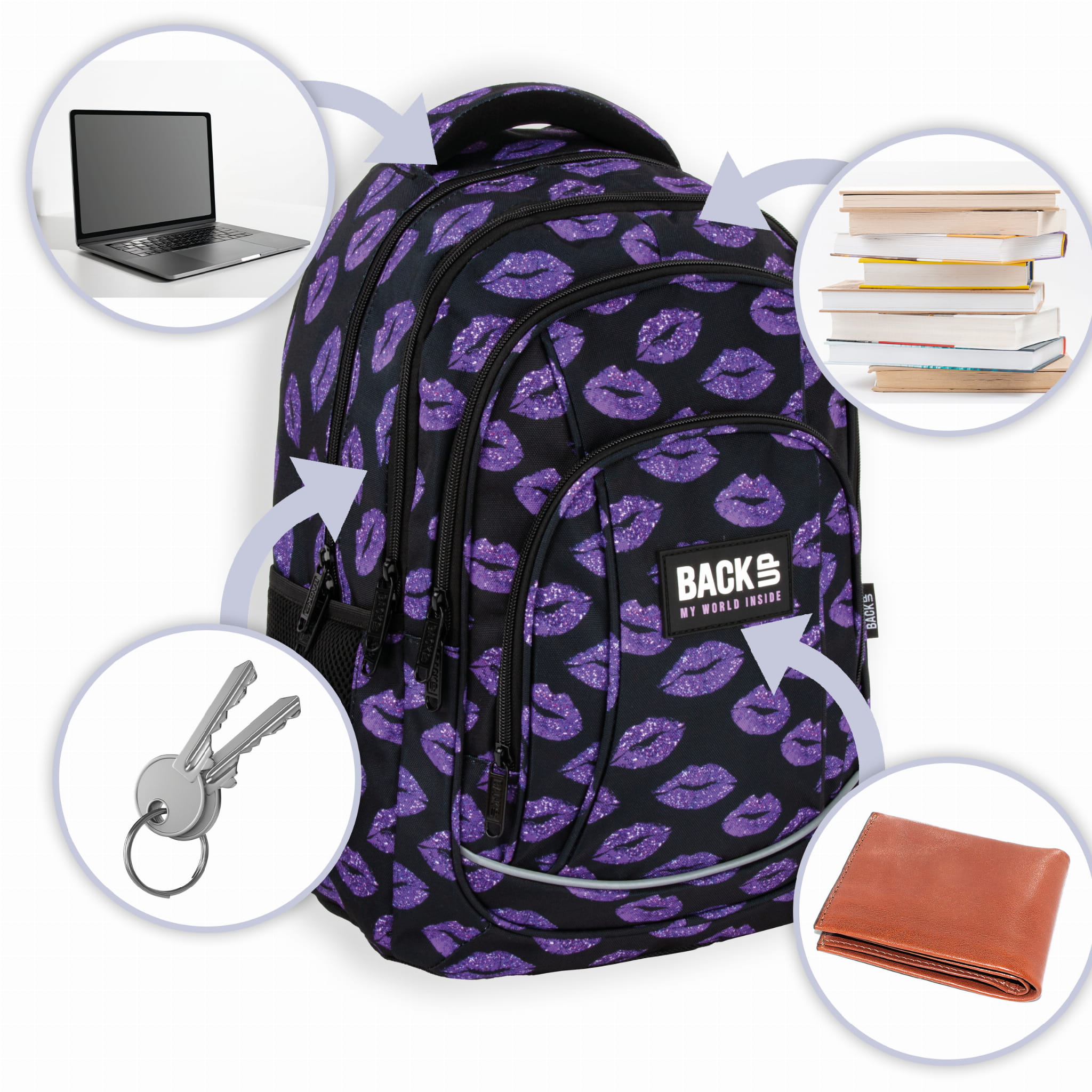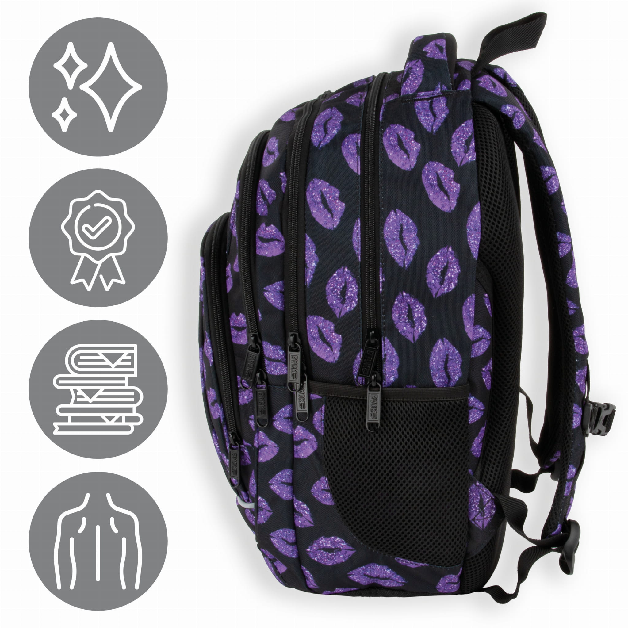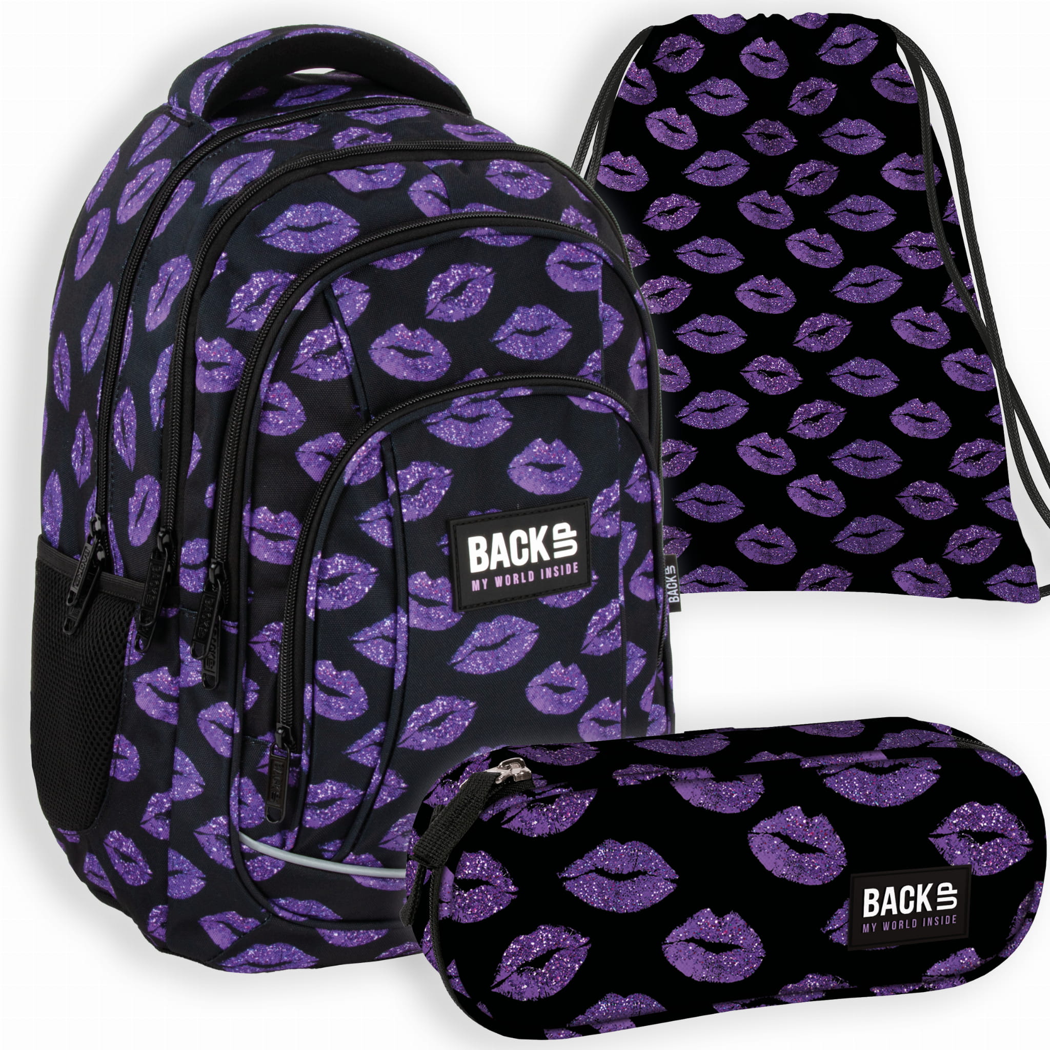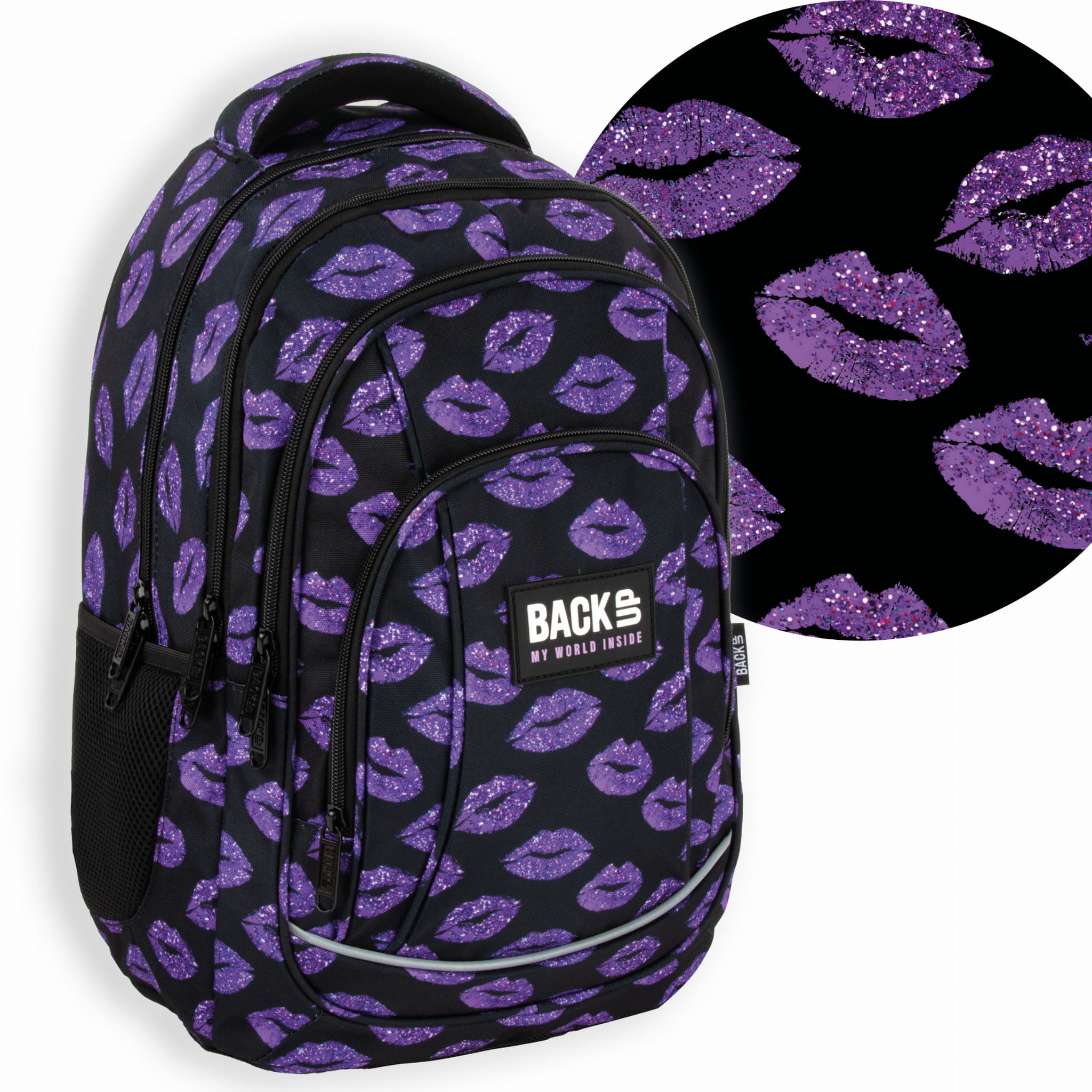 Taniej w zestawie!Plecak szkolny dla dziewczynki Back Up fioletowe usta na czarnym, brokatowy,