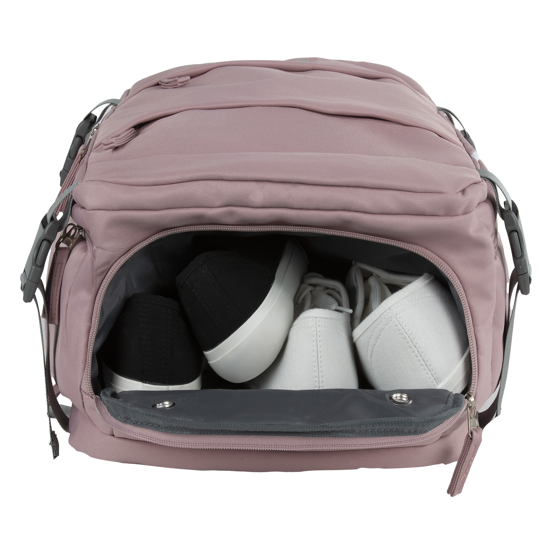 ✅ Uniwersalny, różowy kolor z popielatowymi detalami (zamki, paski, szelki) – elegancki i profesjonalny wygląd dla kobiet i mężczyzn.
