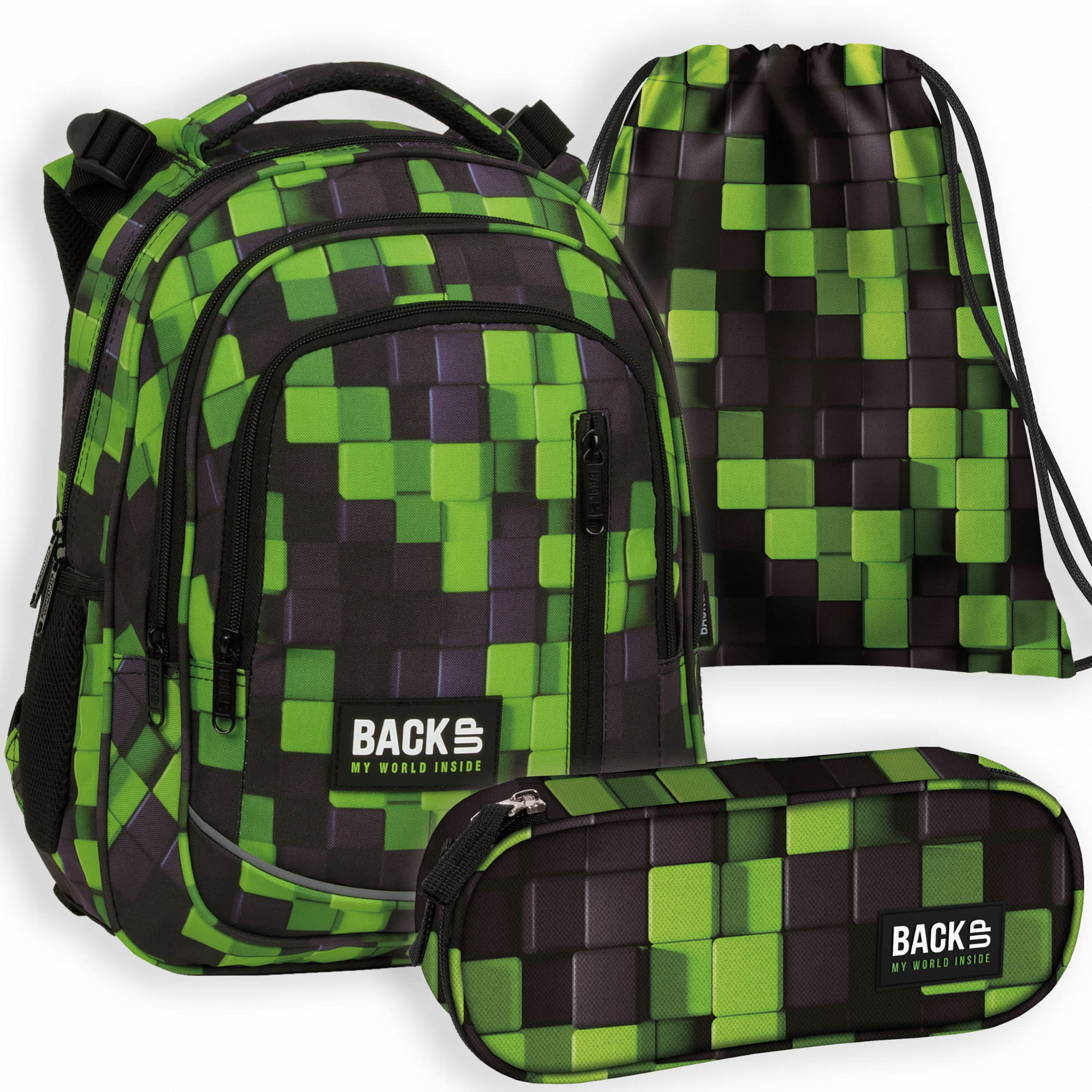 Zestaw szkolny dla chłopca 3w1 Back Up – plecak + piórnik z wyposażeniem + worek, czarny gamingowy z zielonym, do pierwszej klasy